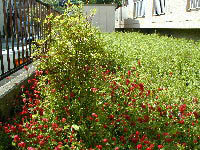 上の3月12日撮影の左右のの画像では見えないが、フェンス側にドウダンツツジを9株植えてあります。 左は5月2日の一番日当たりの悪い場所に植えてあるドウダンツツジの周辺の画像です。 右は5月8日の同じく一番日当たりの悪い場所に植えてあるドウダンツツジが周辺のクリムソンクローバーに囲まれている画像です。 |