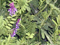 左が可憐なクリムソンクローバーの開花で、苺の実の様な赤色い可愛い花で、真ん中付近に白い花びらを付けたものが一つ開花(既にマーキングして居り、種はプランターで栽培予定)している。撮影は5月8日。 右がヘアリーベッチの開花の画像で、薄紫の美しい花が開花しており、撮影は5月2日。 |