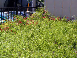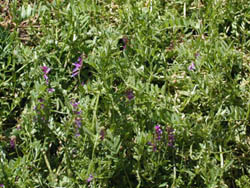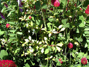 左はヘアリーベッチの繁茂の様子で、地面を這う様に所々に紫色の花が咲いている。 右はドウダンツツジの周辺に播いたクリムソンクローバーの開花の様子で、ヘアリーベッチが徐々に前記二種類の植物に取り巻きつつある。 低木で成長の遅いドウダンツツジには酷な状態である。 |