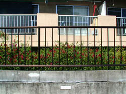 左は前庭中程の画像で、クリムソンクローバーの花盛りとでも云いましょうか、もう少し早く克つ工夫して播けばもっと綺麗になるでしょう。 右の画像はその裏側の写真でヘアーベッチが少しづつフェンス方向に進出し始めている。 |