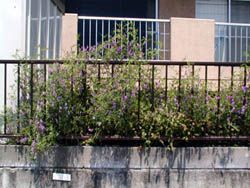 左は一番日当たりの良い場所のドウダンツツジを取り巻くヘアリーベッチで、既にフェンスからはみ出るだけでなくその丈も大きくを超えている程旺盛に繁茂している。 倉庫の反射の影響も多分にある。 右は前庭全体を東方向から撮影したものでヘアリーベッチが旺盛に繁茂している。 |