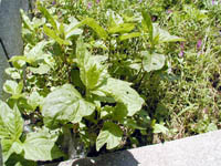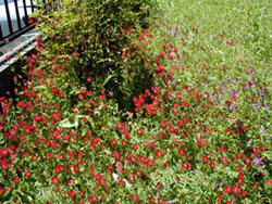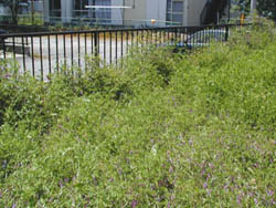 左は一番日当たりの悪い場所のドウダンツツジの周辺で、花は小振りだがクリムソンクローバーがまだ咲いている。 右は一番日当たりの悪い場所の建物側で最も日照条件が悪く、画像の如くヘアリーベッチの成長も遅く雑草も多い。 此の植物の名前は現時点では不明だが、一所に集まって繁茂しているので、どうも地下茎に依る成長の様である。 |