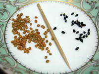 左は一番上の左側の画像の中心付近の、枯れかかっているクリムソンクローバーの姿で、ヘアリーベッチの繁茂に対抗するように日の当たる方へ首をもたげていて、もう結実している様である。 右の画像は昨年播いた残りのクリムソンクローバーの種で、楊子を間にしてその右に黒胡麻を配置し比べると少し胡麻より大きい位で、白胡麻と間違えそう。 |