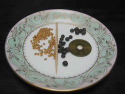 今回の種子の御紹介をします。 左の画像の左側が、カネコ種苗株式会社の500g入りクリムソンクローバーで右側がタキイ種苗株式会社の1kg入りヘアリーベッチの種子、真ん中に小皿に置いてそれぞれの種を配置し対比させる。 右の画像は楊子を境に五円硬貨のある方がヘアリーベッチの種で、比較すると大きさが良く解る。 |