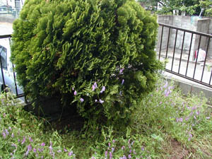 左の画像は常緑針葉樹に絡み付くヘアリーベッチで、開花もしている。