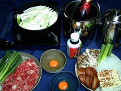 ベーシックな材料は牛肉肩ロース、長葱、焼き豆腐、白滝、椎茸、それに割り下と生卵で基本的に春菊は使いません。