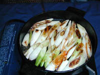 素早く長葱を一方の脇に寄せ、割り下も長葱も焦げ付きそうな場合は少々 水を足します。 旨味が一杯の長葱は、只焼いて醤油をかけても美味しく食べられますね! |
