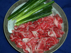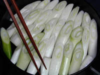 先ずはスキヤキ(牛鍋)なのに変と思うでしょうが、長葱からにします。 スキヤキ鍋に牛脂を溶かし、斜切りにした長葱を隙間無く並べます。 今回は 残念ながら程良い太さのものが無く、本来でしたら2本で一面が長葱になるの です。 |