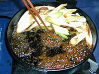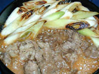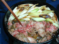 表現は変ですが、焼き込むように煮込みます。 肉を裏返し、有る程度火が通って来たら食べ頃ですので、長葱と肉を味わ いましょう。 |